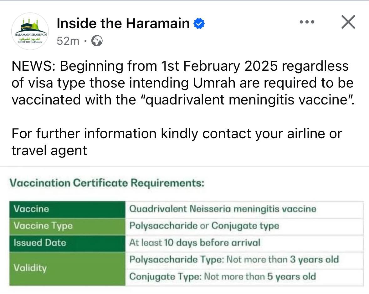 ಜಿದ್ದಾ: ಉಮ್ರಾವನ್ನು ಉದ್ದೇಶಿಸಿರುವವರಿಗೆ “ಕ್ವಾಡ್ರಿವೇಲೆಂಟ್ ಮೆನಿಂಜೈಟಿಸ್ ಲಸಿಕೆ” ಹಾಕುವ ಅಗತ್ಯವಿದೆ ಎಂದು ಎರಡೂ ಹರಂ ಕಾರ್ಯಾಲಯದ ಅಧಿಕೃತ ಫೇಸ್ಬುಕ್ ಪುಟದಲ್ಲಿ ಪ್ರಕಟಿಸಿದೆ. ಇದು ಫೆಬ್ರವರಿ ಒಂದರಿಂದ ಜಾರಿಗೆ ಬರಲಿದೆ.