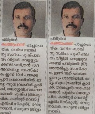 ಪವಿತ್ರನ್ ಮೃತಪಟ್ಟಿದ್ದಾರೆಂದು ಕುಟುಂಬಸ್ಥರು ಮಲಯಾಳಂ ಪತ್ರಿಕೆಗೆ ನೀಡಿದ ವರದಿ