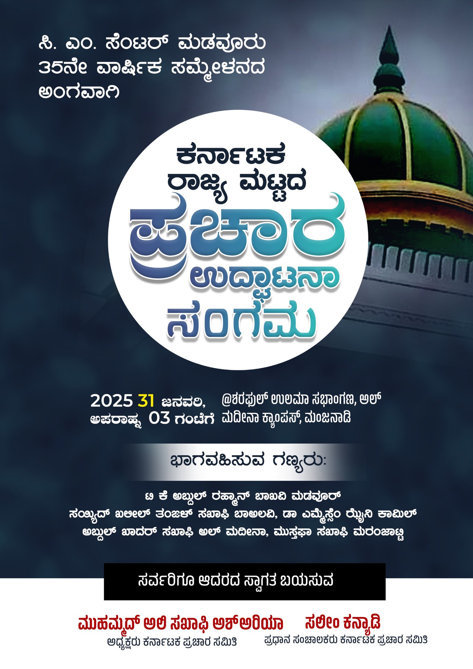 ಮಂಜನಾಡಿ: ಕೋಝಿಕ್ಕೋಡು ಜಿಲ್ಲೆಯ ಮಡೂವೂರಿನಲ್ಲಿ ಅಂತ್ಯ ವಿಶ್ರಾಂತಿ ಪಡೆಯುತ್ತಿರುವ ಖುತುಬುಲ್ ಆಲಂ ಶೈಖ್ ಸಿಎಂ ವಲಿಯುಲ್ಲಾಹಿ (ಖ.ಸಿ )ರವರ ಸ್ಮರಣಾರ್ಥ, ಇಂಡಿಯನ್ ಗ್ರ್ಯಾಂಡ್ ಮುಫ್ತಿ ಸುಲ್ತಾನುಲ್ ಉಲಮಾ ಎಪಿ ಉಸ್ತಾದರ ನೇತೃತ್ವದಲ್ಲಿ ಮಡವೂರಿನಲ್ಲಿ ಕಳೆದ 35 ವರ್ಷಗಳಿಂದ ಕಾರ್ಯಾಚರಣೆ ಮಾಡುತ್ತಿರುವ ಸಿಎಂ ಸೆಂಟರ್ ವಿದ್ಯಾ ಸಂಸ್ಥೆಯ 35ನೇ ವಾರ್ಷಿಕ ಸಮ್ಮೇಳನದ ಕರ್ನಾಟಕ ರಾಜ್ಯದ ಪ್ರಚಾರ ಉದ್ಘಾಟನಾ ಸಮಾವೇಶವು ಜನವರಿ 31 ಶುಕ್ರವಾರ ಅಪರಾಹ್ನ 3 ಗಂಟೆಗೆ ಮಂಜನಾಡಿ ಅಲ್ ಮದಿನಾ ಕ್ಯಾಂಪಸ್ ನಲ್ಲಿರುವ ಶರಫುಲ್ ಉಲಮಾ ಆಡಿಟೋರಿಯಂ ನಲ್ಲಿ ನಡೆಯಲಿದೆ.