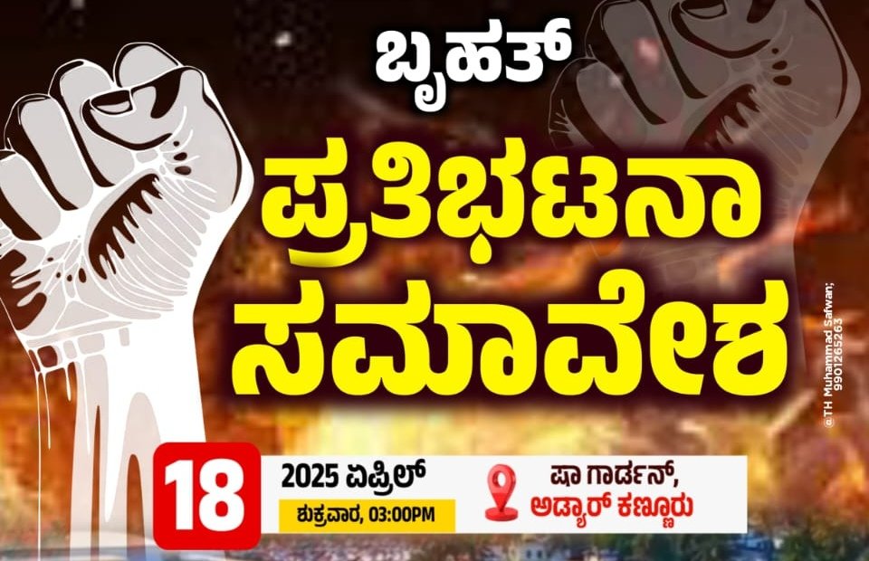 ಮಂಗಳೂರು :ಕೇಂದ್ರ ಸರಕಾರದ ಕರಾಳ ವಕ್ಫ್ ತಿದ್ದುಪಡಿ ಕಾಯಿದೆ ಅನುಷ್ಠಾನ ವನ್ನು ವಿರೋಧಿಸಿ ಕರ್ನಾಟಕ ಉಲಮಾ ಕೋ ಆರ್ಡಿನೇಶನ್ ವತಿಯಿಂದ ದ,ಕ ಜಿಲ್ಲಾ ಖಾಝಿಗಳ ಸಂಯುಕ್ತ ನೇತೃತ್ವದಲ್ಲಿ ನಾಳೆ ಎಪ್ರಿಲ್ 18 ಶುಕ್ರವಾರ ಮಧ್ಯಾಹ್ನ 3 ಗಂಟೆಗೆ ಅಡ್ಯಾರಿನಲ್ಲಿರುವ ಷಾ ಗಾರ್ಡನ್ ನಲ್ಲಿ ಆಯೋಜಿಸಲಾದ ಪ್ರತಿಭಟನಾ ಸಮಾವೇಶವನ್ನು ಕರ್ನಾಟಕ ರಾಜ್ಯ ಸುನ್ನೀ ಯುವಜನ ಸಂಘ SჄS ಬೆಳ್ತಂಗಡಿ ಝೋನ್ ಸಮಿತಿ ವ್ಯಾಪ್ತಿಯ ಯೂನಿಟ್ ಗಳಿಂದ ಅತ್ಯಧಿಕ ಸಂಖ್ಯೆಯಲ್ಲಿ ಭಾಗವಹಿಸುವ ಮೂಲಕ ಯಶಸ್ವಿಗೊಳಿಸಬೇಕಾಗಿ ವಿನಂತಿ.