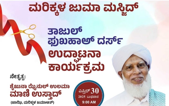 ಮರಿಕ್ಕಳ ಜುಮಾ ಮಸ್ಜಿದ್ ಅಧೀನದಲ್ಲಿ ನಡೆಯುತ್ತಿರುವ ತಾಜುಲ್ ಫುಖಹಾಅ್ ದರ್ಸ್ ನ ಉದ್ಘಾಟನಾ ಕಾರ್ಯಕ್ರಮವು ಮರಿಕ್ಕಳ ಜಮಾಅತ್ ಖಾಝಿ ಶೈಖುನಾ ಝೈನುಲ್ ಉಲಮಾ ಮಾಣಿ ಉಸ್ತಾದರ ನೇತೃತ್ವದಲ್ಲಿ ಎಪ್ರಿಲ್ 30 ಬುಧವಾರ ಬೆಳಿಗ್ಗೆ 9:00 ಗಂಟೆಗೆ ನಡೆಯಲಿರುವುದು.