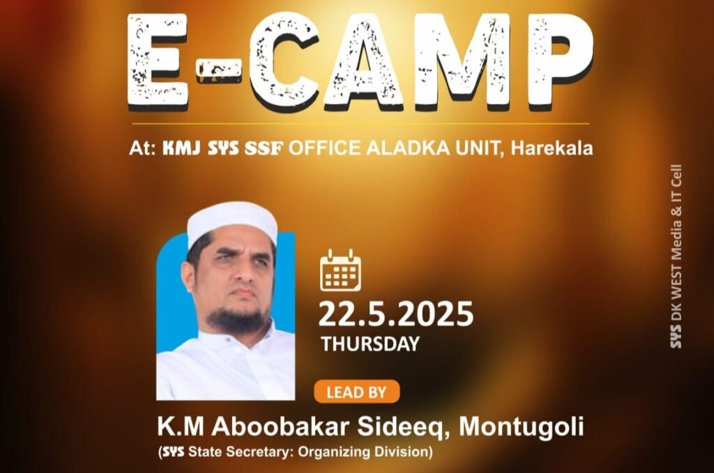 ಎಸ್ವೈಎಸ್ ದ.ಕ ವೆಸ್ಟ್ ಜಿಲ್ಲಾ ಸಮಿತಿ ವತಿಯಿಂದ ಜಿಲ್ಲಾ ಕಾರ್ಯಕಾರಿ ಸಮಿತಿ ನಾಯಕರಿಗಾಗಿ ನಡೆಸಲಾಗುವ ‘ಇ- ಕ್ಯಾಂಪ್’ ಕಾರ್ಯಕ್ರಮವು ಎಸ್ವೈಎಸ್ ದ.ಕ ವೆಸ್ಟ್ ಜಿಲ್ಲಾಧ್ಯಕ್ಷರಾದ ಮಹ್ಬೂಬ್ ಸಖಾಫಿ ಕಿನ್ಯರವರ ಅಧ್ಯಕ್ಷತೆಯಲ್ಲಿ ಮೇ 22 ಗುರುವಾರ ಸಂಜೆ 4:00 ಗಂಟೆಗೆ ಸುನ್ನೀ ಸೆಂಟರ್ ಆಲಡ್ಕ, ಹರೇಕಳದಲ್ಲಿ ನಡೆಯಲಿದೆ.