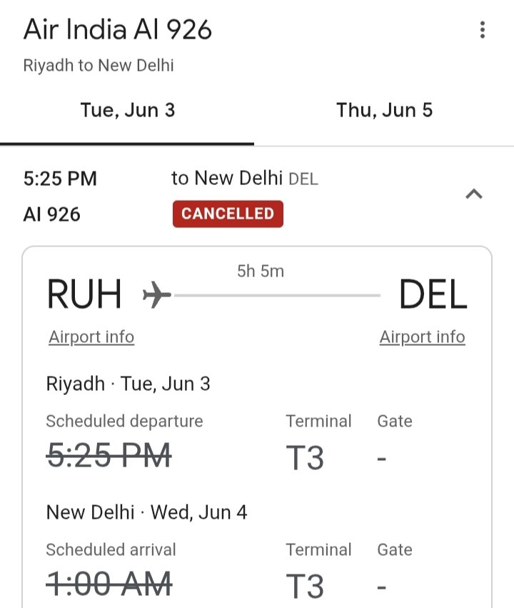 ಇದೀಗ ಸೌದಿ ಅರೇಬಿಯಾದ ರಿಯಾದ್ ನಿಂದ ಜೂ.03 ರ ಸಂಜೆ 5:25ಕ್ಕೆ ದೆಹಲಿಗೆ ಹೊರಡಬೇಕಾಗಿದ್ದ ಏರ್ ಇಂಡಿಯಾ ವಿಮಾನವು ತಾಂತ್ರಿಕ ದೋಷದಿಂದಾಗಿ ಅನಿಶ್ಚಿತವಾಗಿ ವಿಳಂಬವಾಗುತ್ತಿದ್ದು, ಪ್ರಯಾಣಿಕರು ರಿಯಾದ್ ವಿಮಾನ ನಿಲ್ದಾಣದಲ್ಲಿ ಪರದಾಡುವಂತಾಗಿದೆ ಎಂದು ತಿಳಿದುಬಂದಿದೆ.