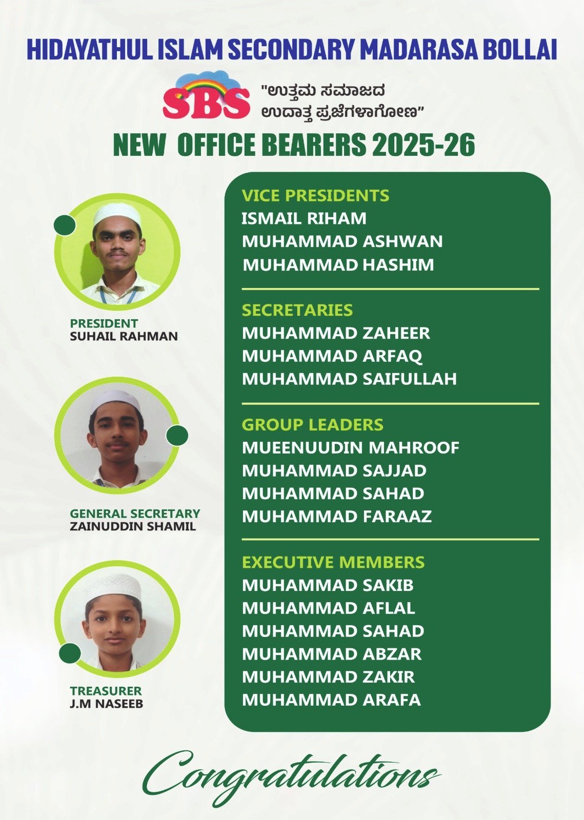 ಅಧ್ಯಕ್ಷರಾಗಿ ಸುಹೈಲ್ ರಹ್ಮಾನ್, ಪ್ರಧಾನ ಕಾರ್ಯದರ್ಶಿಯಾಗಿ ಝೈನುದ್ದೀನ್ ಶಾಮಿಲ್ , ಕೋಶಾಧಿಕಾರಿಯಾಗಿ J.M ನಸೀಬ್ ಆಯ್ಕೆಯಾದರು. ಸದ್ರಿ ಸಮಿತಿಯ ಉಪಾಧ್ಯಕ್ಷರಾಗಿ ಇಸ್ಮಾಯಿಲ್ ರಿಹಾಂ, ಮುಹಮ್ಮದ್ ಅಶ್ವನ್, ಮುಹಮ್ಮದ್ ಹಾಶಿಮ್, ಕಾರ್ಯದರ್ಶಿಗಳಾಗಿ ಮುಹಮ್ಮದ್ ಝಾಹೀರ್, ಅಹ್ಮದ್ ಅರ್ಫಾಕ್, ಮುಹಮ್ಮದ್ ಸೈಫುಲ್ಲಾ, ಗ್ರೂಪ್ ಲೀಡರ್ ಗಳಾಗಿ ಮುಈನುದ್ದೀನ್ ಮಹ್ರೂಫ್, ಮುಹಮ್ಮದ್ ಸಜ್ಜಾದ್ , ಮುಹಮ್ಮದ್ ಸಹದ್, ಮುಹಮ್ಮದ್ ಫರಾಝ್.
