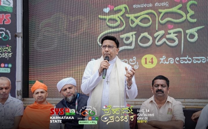 ಕಾರ್ಕಳ ತಲುಪಿದ ‘ಸೌಹಾರ್ದ ಸಂಚಾರ’ ದಲ್ಲಿ ಸ್ವಸ್ತಿ ಶ್ರೀ ಚಾರುಕೀರ್ತಿ ಭಟ್ಟಾರಕ ಸ್ವಾಮೀಜಿ ಮೂಡುಬಿದಿರೆ ಜೈನ ಬಸದಿ, ಅತ್ತೂರು ರೆವರೆಂಡ್ ಫಾದರ್ ಅಲ್ವಿನ್ ಡಿಸೋಜ, ಕಾರ್ಕಳ ವೆಂಕಟರಮಣ ದೇವಾಲಯದ ಉಲ್ಲಾಸ ಶೆಣೈ ಮಾತನಾಡಿದರು.