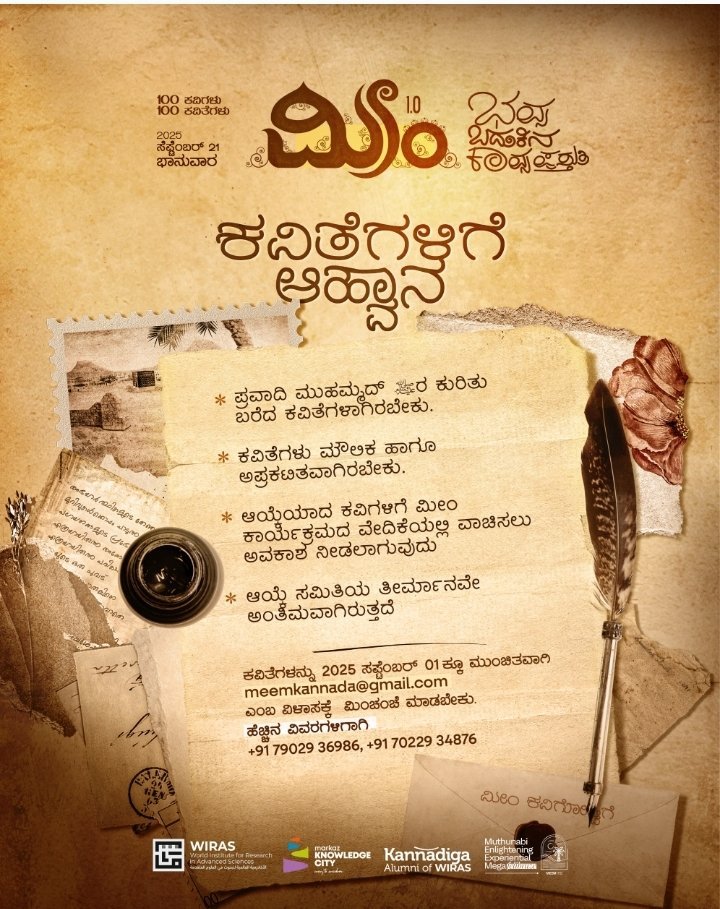 ಬೆಂಗಳೂರು: ಮರ್ಕಝ್ ನಾಲೆಜ್ ಸಿಟಿ ಅಧೀನದ ವಿರಾಸ್ ಕನ್ನಡ ವಿದ್ಯಾರ್ಥಿಗಳ ಸಂಘಟನೆಯು ಆಯೋಜಿಸುವ ‘ಮೀಮ್’ ಮೂರನೇ ಆವೃತ್ತಿಯ ಭಾಗವಾಗಿ ನಡೆಯಲಿರುವ ಕವಿಗೋಷ್ಠಿಗೆ ಕವಿತೆಗಳನ್ನು ಆಹ್ವಾನಿಸಲಾಗಿದೆ. ಕವಿತೆ ಪೈಗಂಬರ್ ಮುಹಮ್ಮದ್ ಅವರ ಕುರಿತಾಗಿ ರಚಿಸಿರಬೇಕು ಮತ್ತು ಸ್ವರಚಿತ ಹಾಗೂ ಅಪ್ರಕಟಿತವಾಗಿರಬೇಕು.