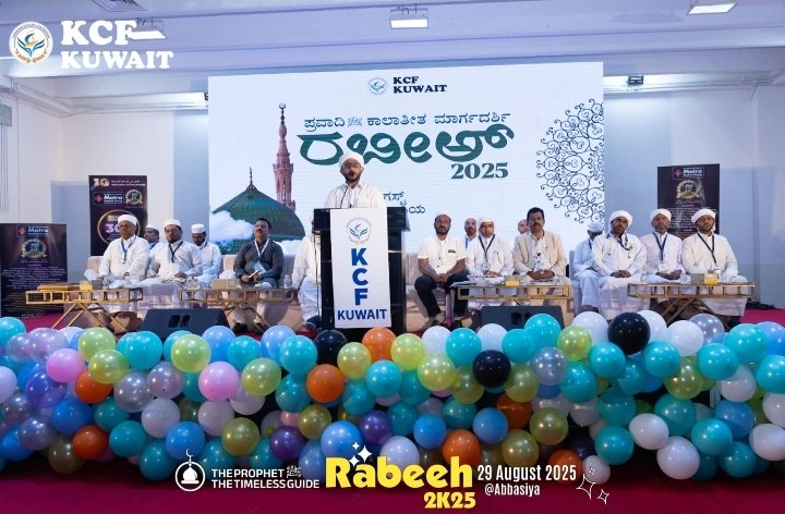 ಪ್ರವಾದಿ (ﷺ) ಕಾಲಾತೀತ ಮಾರ್ಗದರ್ಶಿ ಎಂಬ ಘೋಷ ವಾಕ್ಯದೊಂದಿಗೆ ಗ್ರ್ಯಾಂಡ್ ಮೀಲಾದ್ ಕಾನ್ಫರೆನ್ಸ್ ದಿನಾಂಕ ಅಗೋಷ್ಟ್ 29 ಶುಕ್ರವಾರ 5:00pm ಸರಿಯಾಗಿ ಅಬ್ಬಾಸಿಯ Aspire ಸ್ಕೂಲ್ ನಲ್ಲಿ ಕೆಸಿಎಫ್ ಕುವೈಟ್ ರಾಷ್ಟ್ರೀಯ ಸಂಘಟನಾ ವಿಭಾಗದ ಅಧ್ಯಕ್ಷರಾದ ಬಹು ಬಾದಾಷ ಸಖಾಫಿ ಹಾಗೂ ಕೆಸಿಎಫ್ ಕುವೈಟ್ ರಾಷ್ಟ್ರೀಯ ಶಿಕ್ಷಣ ವಿಭಾಗದ ಅಧ್ಯಕ್ಷರಾದ ಸಾಹುಲ್ ಹಮೀದ್ ಸಅದಿ ಝುಹ್ರಿ ಹಾಗೂ ಆಡಳಿತ ವಿಭಾಗದ ಅಧ್ಯಕ್ಷರಾದ ಉಮರುಲ್ ಫಾರೂಕ್ ಸಖಾಫಿ ಮತ್ತು ಕೆಸಿಎಫ್ ಕುವೈಟ್ ಉಲಮಾ, ಉಮರಾ ನಾಯಕರ ಉಪಸ್ಥಿತಿಯಲ್ಲಿ ಮೌಲೂದ್ ಪರಾಯಣದೊಂದಿಗೆ ಆರಂಭವಾಯಿತು.