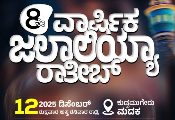 ಕುಡ್ತಮುಗೇರು: ಇಲ್ಲಿನ ಮದಕದಲ್ಲಿ ಬಹು| ಅಸ್ಸಯ್ಯಿದ್ ಯು.ಎಸ್. ಶಿಹಾಬುದ್ಧೀನ್ ಮದಕ ತಂಙಳ್ ರವರ ನೇತೃತ್ವದಲ್ಲಿ ಪ್ರತಿ ವರ್ಷ ನಡೆಯುತ್ತಿರುವ ಜಲಾಲಿಯಾ ರಾತೀಬ್ ಇದರ 8ನೇ ವಾರ್ಷಿಕೋತ್ಸವದ ಮಜ್ಲಿಸ್ ಇದೇ ಬರುವ 12 ಡಿಸೆಂಬರ್ 2025 ರಂದು ಬಹಳ ವಿಜೃಂಭಣೆಯಿಂದ ನಡೆಯಲಿದೆ.