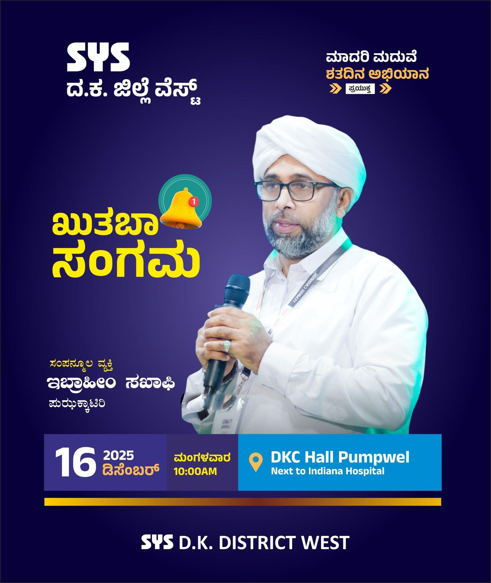 ಮಂಗಳೂರು: ಇತ್ತೀಚಿನ ದಿನಗಳಲ್ಲಿ ಮುಸ್ಲಿಂ ಸಮುದಾಯದ ಮದುವೆ ಸಮಾರಂಭ ಶರೀಅತ್ ಮಿತಿ ಮೀರಿ ಹೋಗುತ್ತಿದ್ದು,ದುಂದುವೆಚ್ಚವೂ ಹೆಚ್ಚುತ್ತಿದೆ. ಇದಕ್ಕೆ ಕಡಿವಾಣ ಹಾಕುವ ನಿಟ್ಟಿನಲ್ಲಿ ಕರ್ನಾಟಕ ರಾಜ್ಯ ಎಸ್ ವೈ ಎಸ್ ನಡೆಸುವ ಮಾದರಿ ಮದುವೆ ಎಂಬ ಶತದಿನ ಅಭಿಯಾನದ ಪ್ರಯುಕ್ತ ದ.ಕ.ವೆಸ್ಟ್ ಜಿಲ್ಲಾ ಸಮಿತಿ ಡಿಸೆಂಬರ್ 16 ಮಂಗಳವಾರ ಪಂಪ್ವೆಲ್ DKC ಹಾಲ್ ನಲ್ಲಿ ಖತೀಬರಿಗಾಗಿ ‘ಖುತಬಾ ಸಂಗಮ’ ಹಮ್ಮಿಕೊಂಡಿದೆ.
