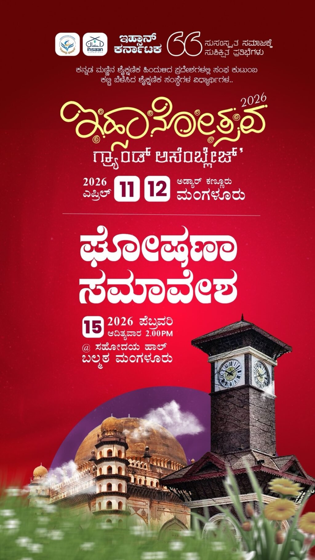 ಇಹ್ಸಾನೋತ್ಸವ-26 ಕಾರ್ಯಕ್ರಮವು 2026 ಎಪ್ರಿಲ್ 11,12 ಶನಿವಾರ, ಭಾನುವಾರ ದಿವಸಗಳಲ್ಲಿ ಮಂಗಳೂರು ಅಡ್ಯಾರ್ ಕಣ್ಣೂರ್ ನಲ್ಲಿ ನಡೆಯಲಿದೆ.