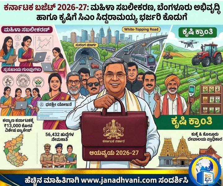 ಬೆಂಗಳೂರು: ಮುಖ್ಯಮಂತ್ರಿ ಸಿದ್ದರಾಮಯ್ಯ ಅವರು ಇಂದು ವಿಧಾನಸಭೆಯಲ್ಲಿ 2026-27ನೇ ಸಾಲಿನ ರಾಜ್ಯ ಬಜೆಟ್ ಮಂಡಿಸಿದರು. ಸಚಿವ ಸಂಪುಟದ ಅನುಮೋದನೆ ಪಡೆದ ಬಳಿಕ ಭಾಷಣ ಆರಂಭಿಸಿದ ಸಿಎಂ, ಕಲ್ಯಾಣ ಕರ್ನಾಟಕದ ಅಭಿವೃದ್ಧಿ, ಬೆಂಗಳೂರಿನ ಸಂಚಾರ ದಟ್ಟಣೆ ನಿವಾರಣೆ ಹಾಗೂ ಮಹಿಳಾ ಕಲ್ಯಾಣಕ್ಕೆ ಹೆಚ್ಚಿನ ಒತ್ತು ನೀಡುವ ಹಲವು ಮಹತ್ವಾಕಾಂಕ್ಷಿ ಯೋಜನೆಗಳನ್ನು ಘೋಷಿಸಿದ್ದಾರೆ.