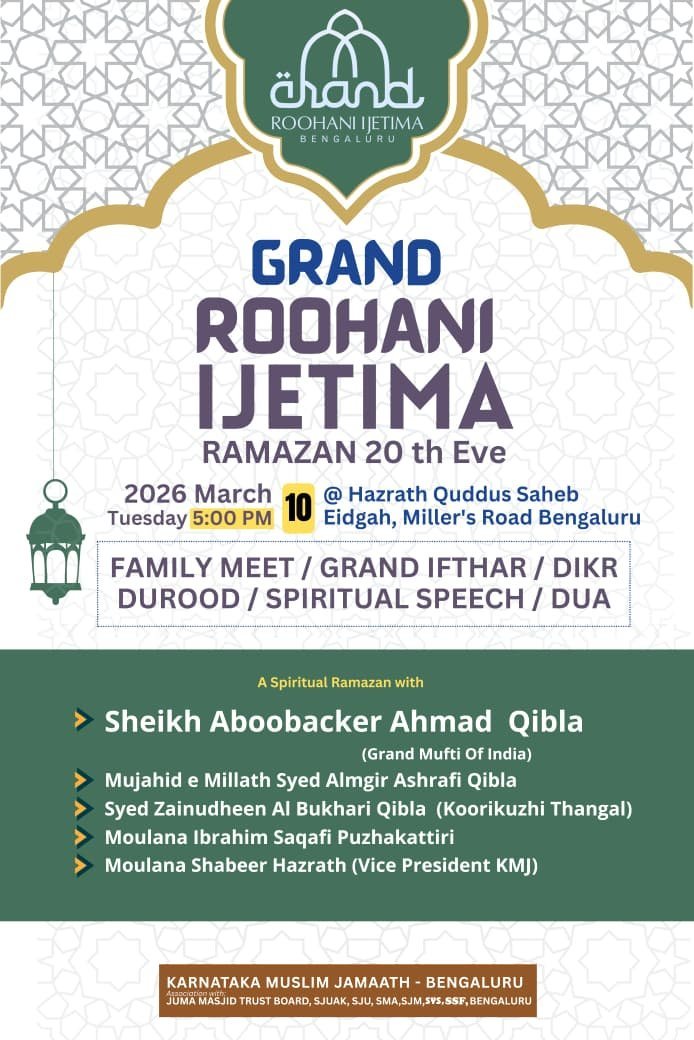 ಬೆಂಗಳೂರು: ರಮಝಾನ್ 21ನೇ ರಾತ್ರಿ, ಜಿಲ್ಲೆಯ ಅತ್ಯಂತ ದೊಡ್ಡ ಧಾರ್ಮಿಕ ಸಮ್ಮೇಳನವಾದ ರೂಹಾನಿ ಇಜ್ತಿಮ್ ಇಂದು ಸಂಜೆ 4 ಗಂಟೆಯಿಂದ ಖುದ್ದೂಸಾಬ್ ಈದ್ಗಾಹ್ ಮೈದಾನದಲ್ಲಿ ಆರಂಭವಾಗಲಿದೆ.