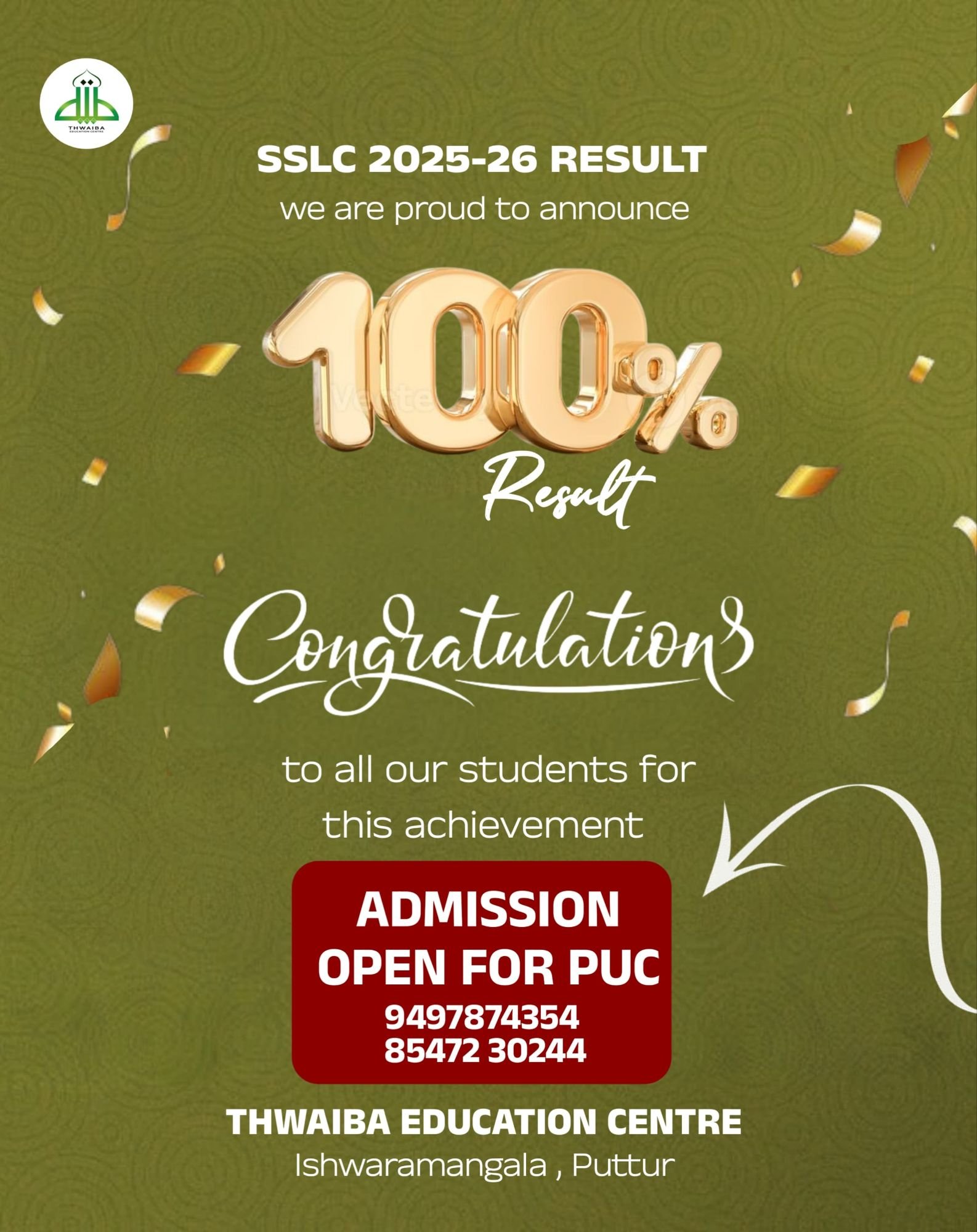 ಈಶ್ವರಮಂಗಲ: ಧಾರ್ಮಿಕ ಮತ್ತು ಲೌಕಿಕ ಶಿಕ್ಷಣದ ಸಮನ್ವಯತೆಯೊಂದಿಗೆ ಗುಣಮಟ್ಟದ ಶಿಕ್ಷಣ ನೀಡುತ್ತಿರುವ ಇಲ್ಲಿನ ಪ್ರತಿಷ್ಠಿತ ‘ತ್ವೈಬಾ ವಿದ್ಯಾಸಂಸ್ಥೆ’ಯು ಈ ಬಾರಿಯ ಎಸ್ಸೆಸ್ಸೆಲ್ಸಿ ಪರೀಕ್ಷೆಯಲ್ಲಿ ಶೇ. 100 ಫಲಿತಾಂಶ ದಾಖಲಿಸುವ ಮೂಲಕ ಗಮನಾರ್ಹ ಸಾಧನೆ ಮಾಡಿದೆ.